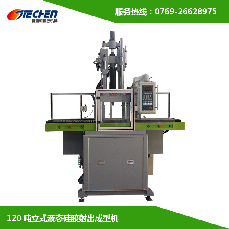 【捷晨機械】120噸立式液態硅膠射出成型機(手機套液態硅膠注塑機)產品特點:1、雙滑板設計(一上二下模),取放件更方便,更可 利用LSR熱固成型時的停頓時間,讓操作員做另一模 取/放及清理模具工作,大大提升生產效率;2、標準120噸鎖模力;品質可靠,價格實惠,提供一年質保,終身維護服務。