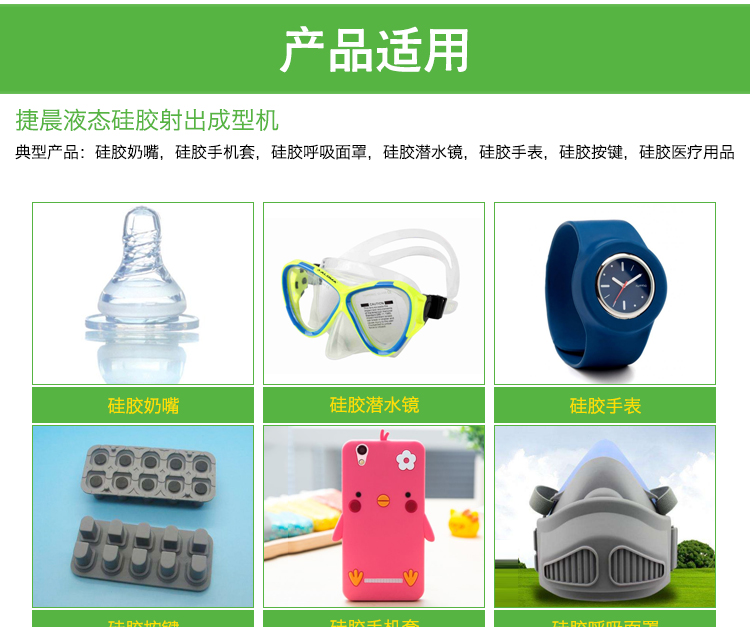 1、各種類型模壓車輛改為固體硅橡膠完成的穿刺操作。 2、涂布紙、嬰童物品、學齡前物品、體育足球物品、廚房衛生間物品、電子為了滿足電子時代發展的需求,新產品等餐飲行業的灌裝數學作業。 典型案例產品設備:透明硅橡膠奶嘴,透明硅橡膠的手機套,透明硅橡膠享受頭罩,透明硅橡膠潛水鏡,透明硅橡膠電子手表,透明硅橡膠鍵盤,透明硅橡膠治療器具